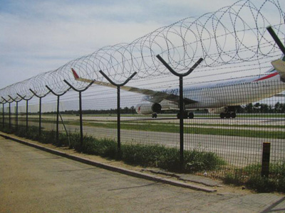機場圍界又稱作“機場護欄”、“Y型安全防御護網”,它是由V型支架立拄,加強型焊接片網,安全防盜連接件和熱鍍鋅刀片刺籠組成是強度和安全防御性級別很高的隔離柵產品。近年來,被廣泛應用在機場,軍事基地等高安全場所。注:如果在機場護欄網頂部加裝刀片刺絲、刀片刺繩后又很好的增強了安全防護性能。