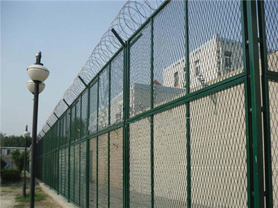 監(jiān)獄護(hù)欄網(wǎng)又稱作“Y型安全防御護(hù)網(wǎng)”和機(jī)場護(hù)欄網(wǎng)通用,是由V型支架立柱,加強(qiáng)型焊接片網(wǎng),安全防盜連接件和熱鍍鋅刀片刺籠組成強(qiáng)度和安全防御性級別很高。近年來,被廣泛應(yīng)用在監(jiān)獄,軍事基地等高安全場所。注:如果在監(jiān)獄護(hù)欄網(wǎng)頂部加裝刀片刺絲、刀片刺繩后又很好的增強(qiáng)了安全防護(hù)性能。采用電鍍、熱鍍、噴塑、浸塑等防腐形式,具有很好的抗老化、抗曬、耐候等特點(diǎn)。其產(chǎn)品造型美觀、花色多樣,既起到圍欄作用,又起到美化作用。由于具有安全性高、防攀爬能力好,網(wǎng)片連接方式采用特制SBS緊扣件,有效防止人為的破壞性拆卸,橫向四道折彎加強(qiáng)筋,使網(wǎng)面強(qiáng)度顯著增加。